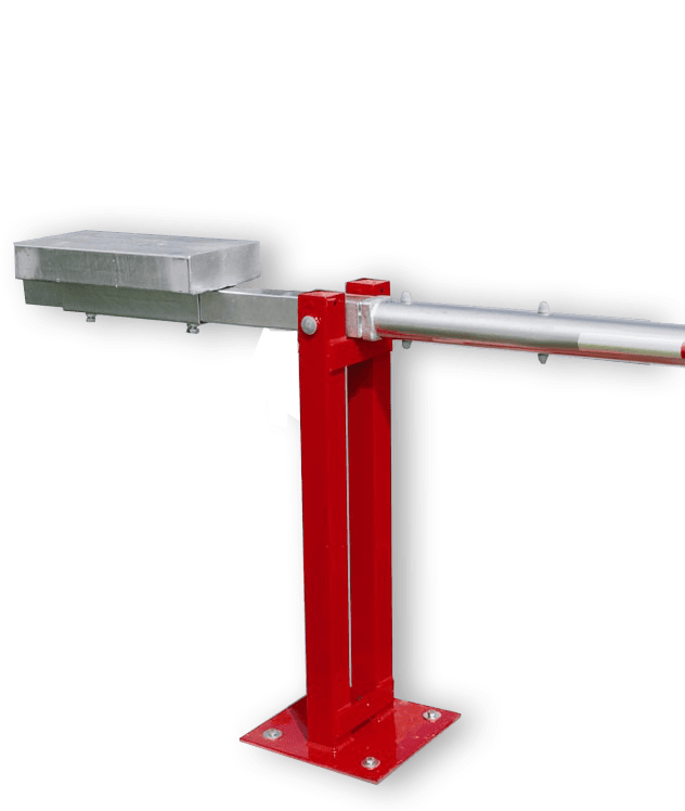 Verzinkt stalen en gecoate (RAL3020) slagboom met contragewicht, steunpaal of pendel.