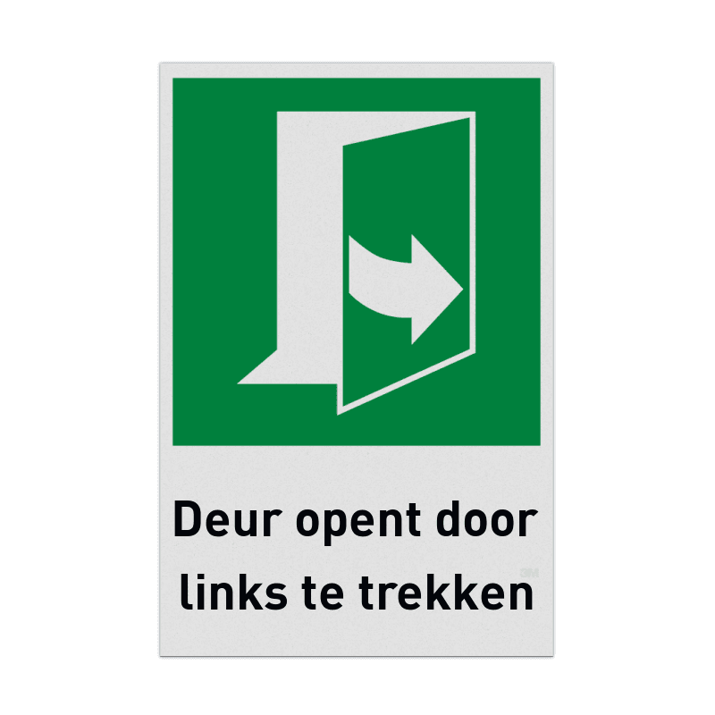 Nooduitgangbord met pictogram en tekst Deur opent door links te trekken