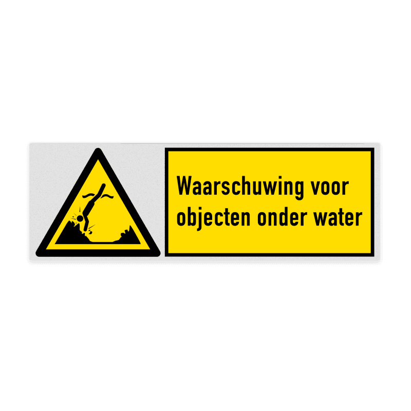 Veiligheidsbord met pictogram en tekst Waarschuwing voor objecten onder water