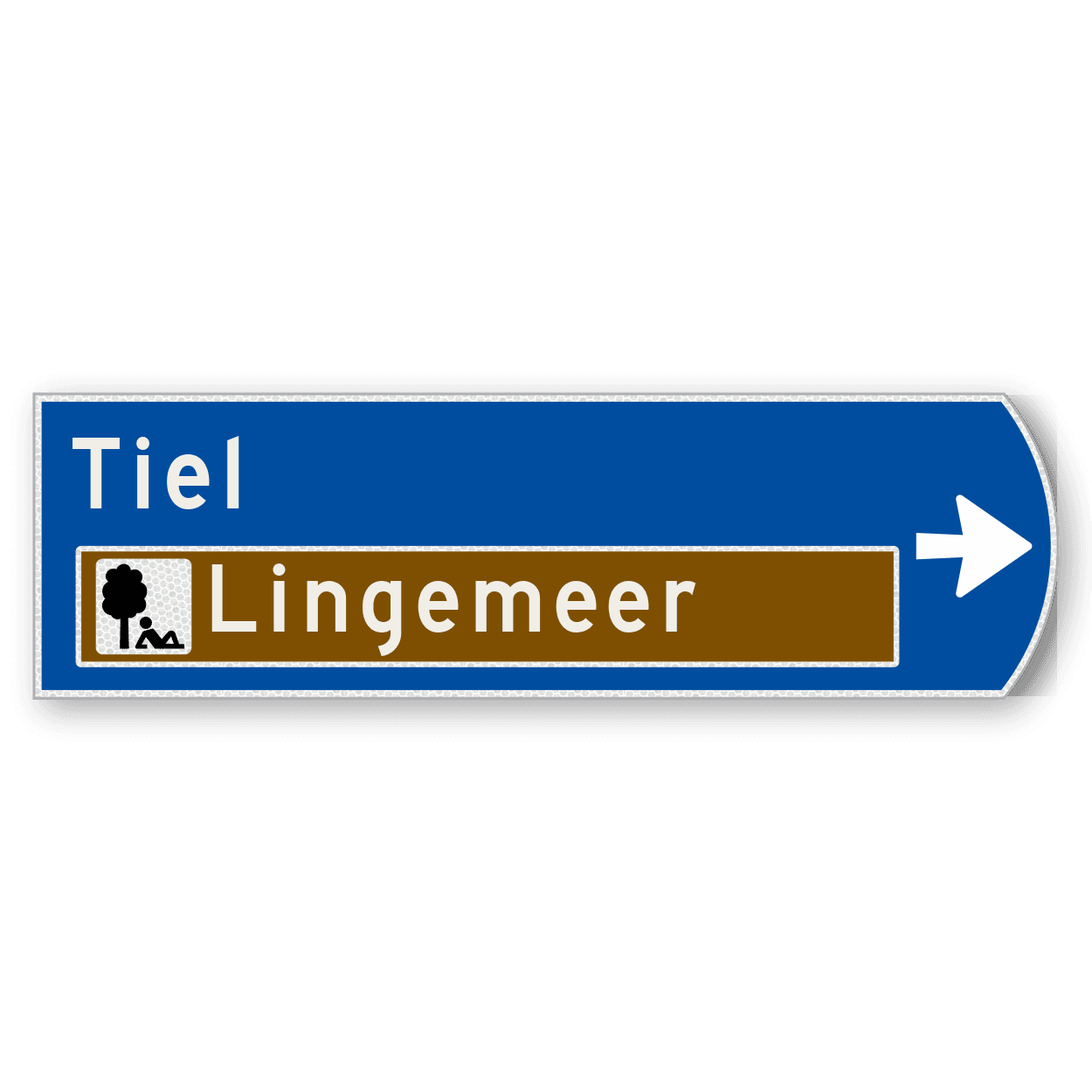 Handwegwijzer klein rechtswijzend met witte tekst en bruin veld onderin 990x295