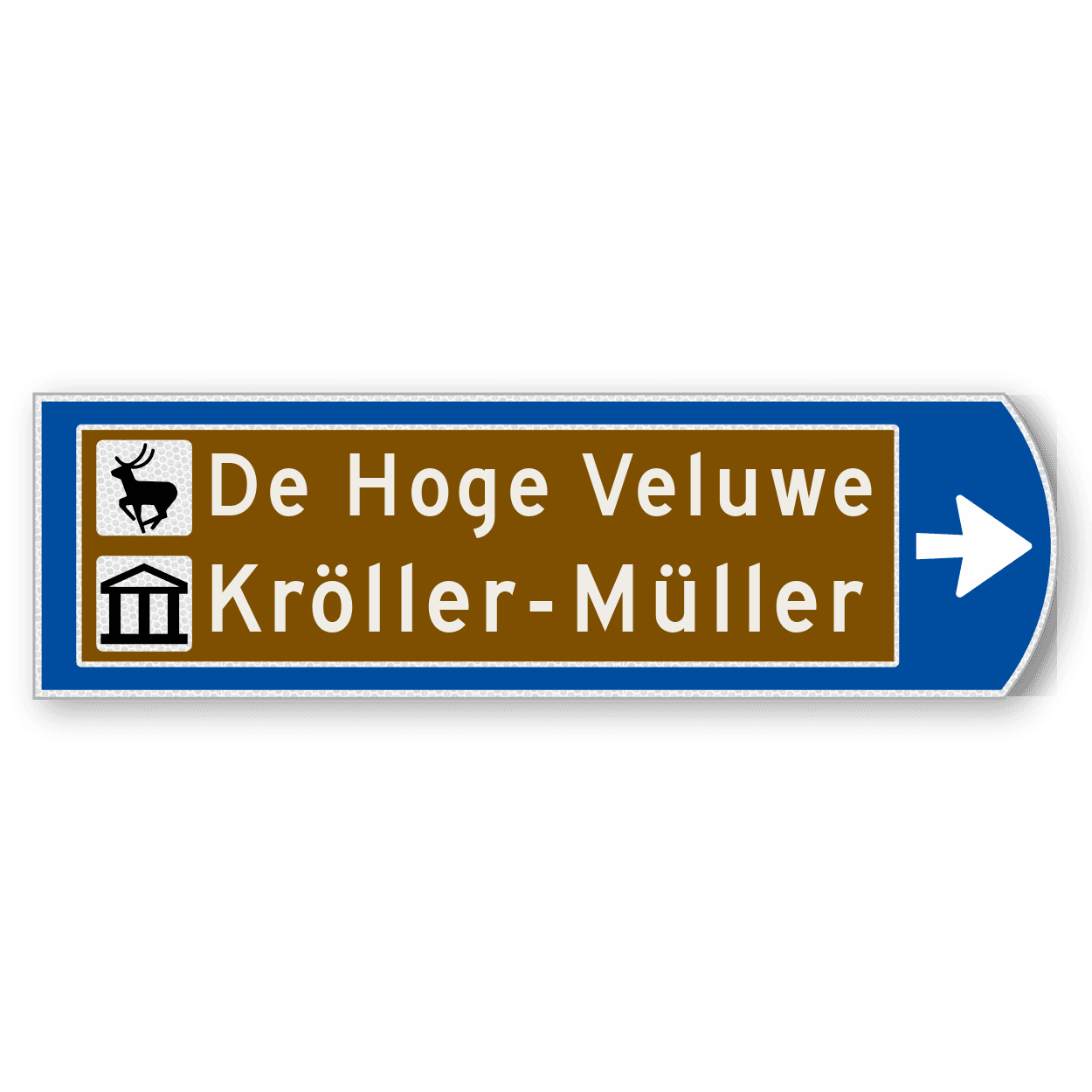 Handwegwijzer klein rechtswijzend met bruin veld met 2 pictogrammen en tekst 990x295