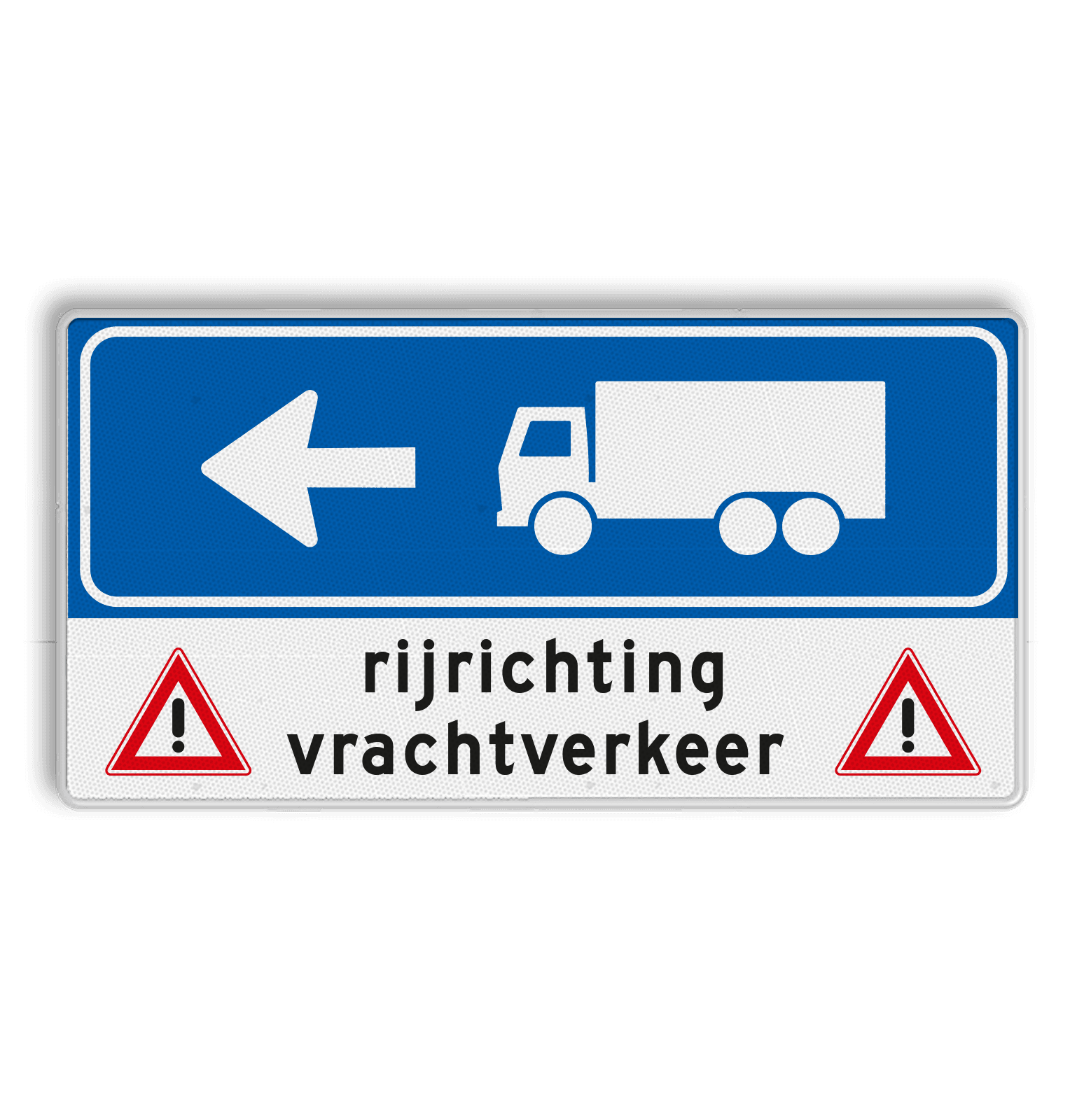 Al onze borden worden - tenzij anders aangegeven - voorzien van reflecterende folie. Deze speciale folie weerkaatst licht en is dankzij een zeer hoog helderheidsniveau altijd goed zichtbaar. Hierdoor zijn (verkeers)borden ook in het donker goed te lezen. Dankzij deze folie komt je boodschap in alle omstandigheden goed over.