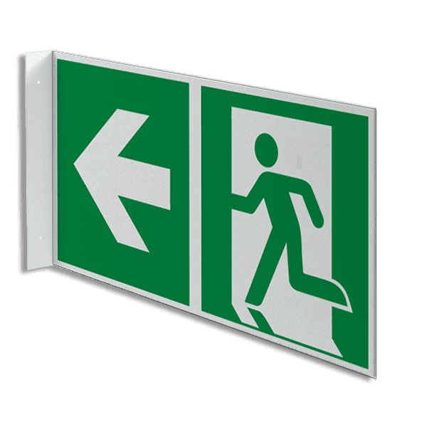 Haaks bord E001 - Nooduitgang links naar boven met pijl