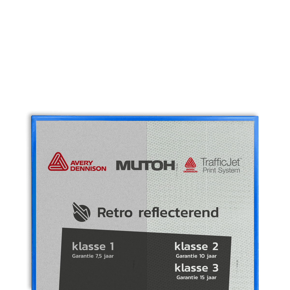 Al onze borden worden - tenzij anders aangegeven - voorzien van reflecterende folie. Deze speciale folie weerkaatst licht en is dankzij een zeer hoog helderheidsniveau altijd goed zichtbaar. Hierdoor zijn (verkeers)borden ook in het donker goed te lezen. Dankzij deze folie komt je boodschap in alle omstandigheden goed over.